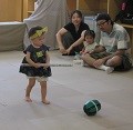 すいか割りは、カップ麺の空き容器を合わせてすいかに見立て、すいか割りを行いました。なかなか割れない子もいましたが、ママやパパと一緒に力いっぱい棒を振り上げ割ることができました。
